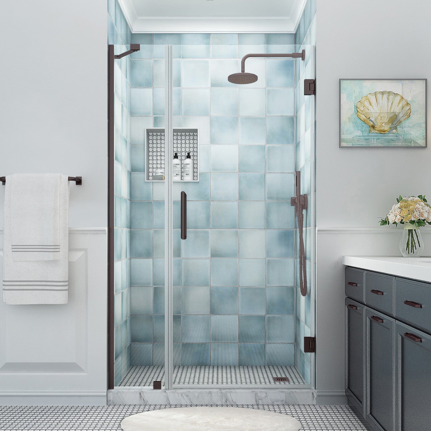 Belmore XL 39.25 in. to 40.25 in. W x 80 in. H Frameless Hinged Shower Door with Clear Glass in Bronze (34 in. Door and 6 in. Fixed Panel)