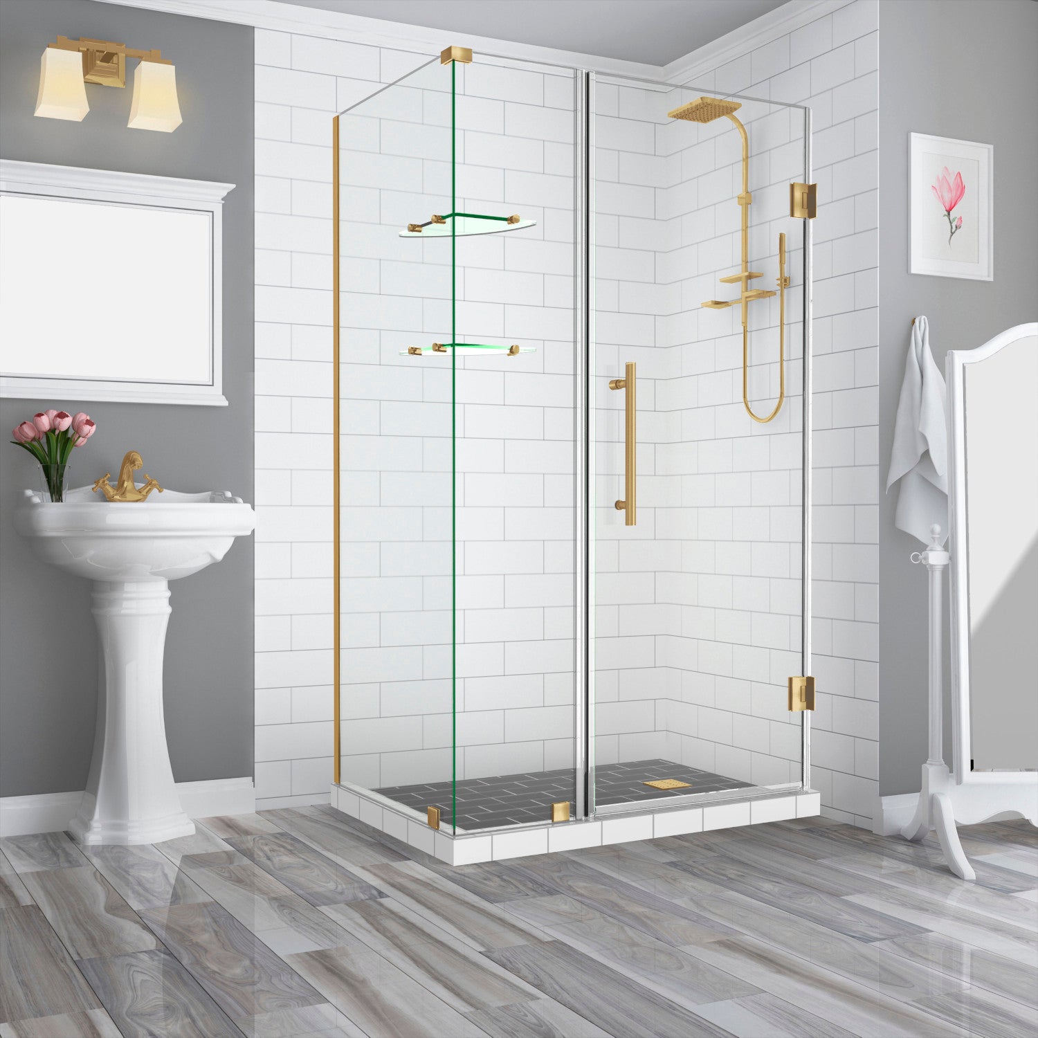 Bromley GS 51.25 in. to 52.25 in. W x 30.375 in. D x 72 in. H Frameless Hinged Shower Enclosure with Clear Glass and Glass Shelves in Brushed Gold (30 in. Door, 22 in. Fixed Panel, and 30 in. Return Panel)