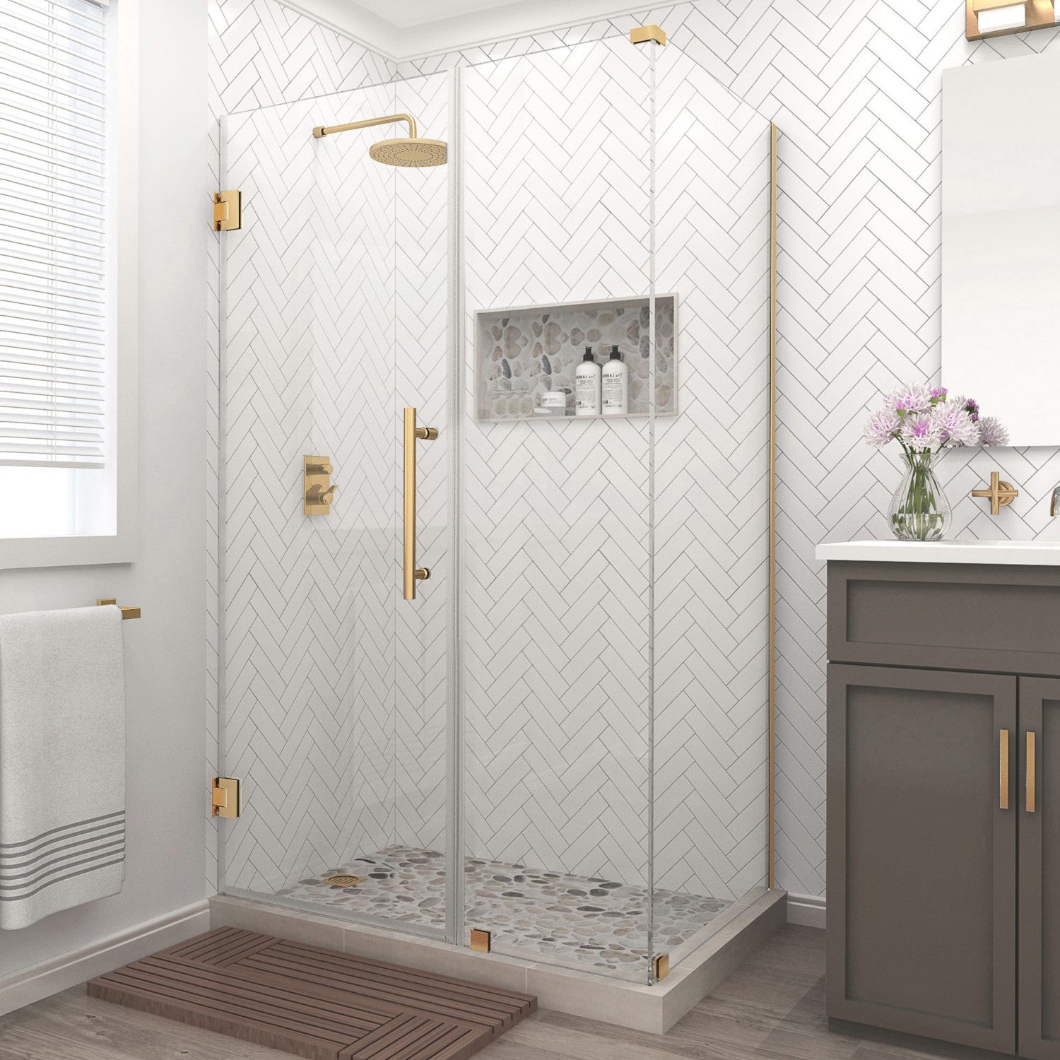 Bromley 47.25 in. to 48.25 in. W x 34.375 in. D x 72 in. H Frameless Hinged Shower Enclosure with Clear Glass in Brushed Gold (26 in. Door, 22 in. Fixed Panel, and 34 in. Return Panel)