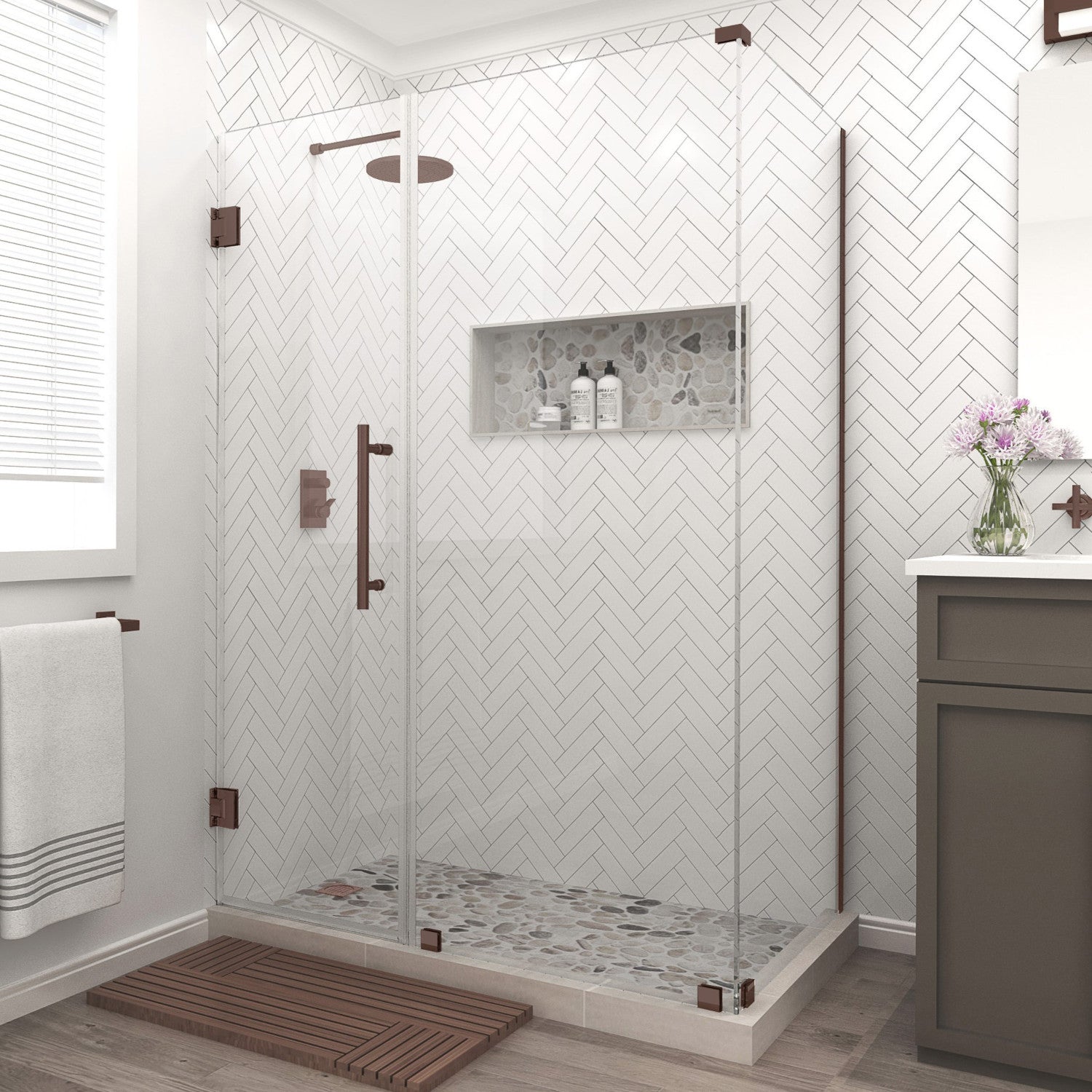 Bromley 51.25 in. to 52.25 in. W x 34.375 in. D x 72 in. H Frameless Hinged Shower Enclosure with Clear Glass in Bronze (22 in. Door, 30 in. Fixed Panel, and 34 in. Return Panel)