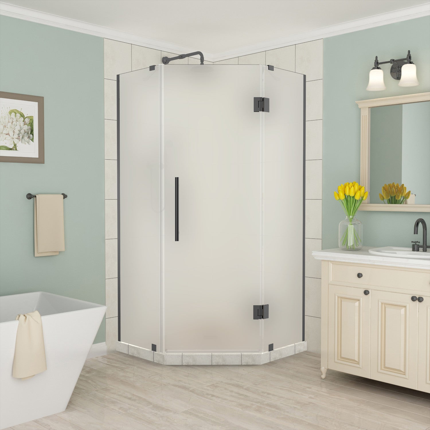 Merrick 40 in. W x 40 in. D x 72 in. H Frameless Neo-Angle Hinged Shower Enclosure with Frosted Glass in Matte Black