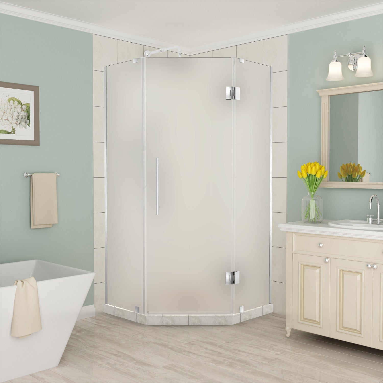 Merrick 34 in. W x 34 in. D x 72 in. H Frameless Neo-Angle Hinged Shower Enclosure with Frosted Glass in Stainless Steel